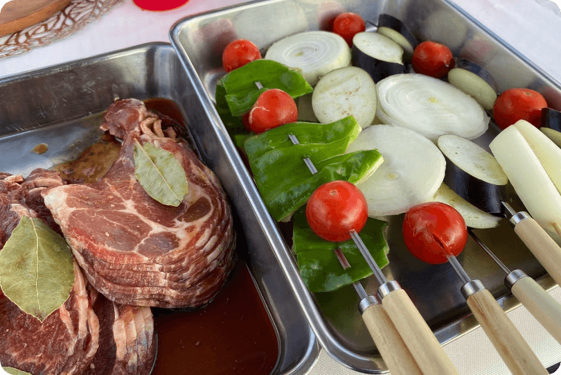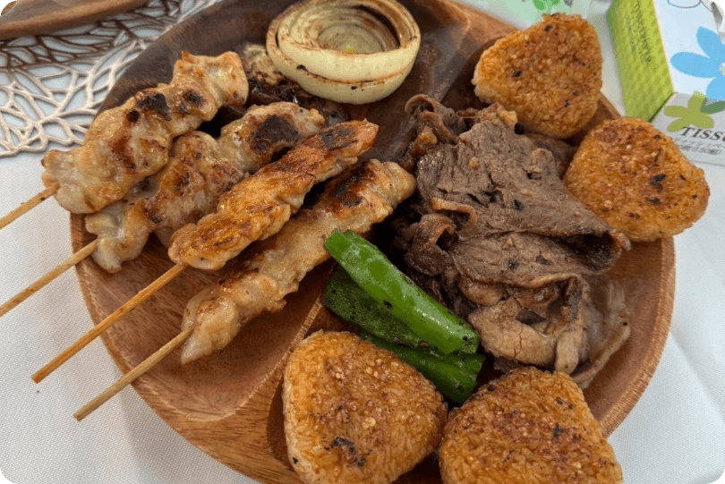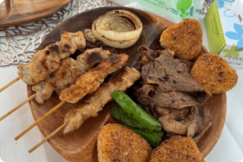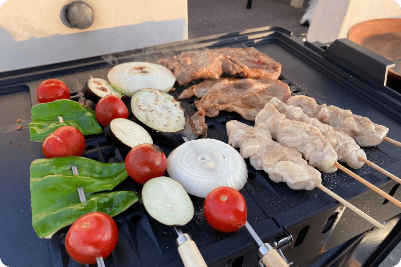 揺れずにトイレもあるので安心です!- BBQは肉(牛肉orアグー豚)、お野菜、焼きそばなどです